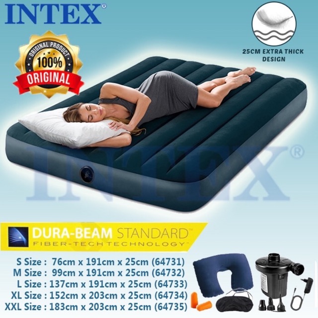 INTEX tilam Angin 25CM Tebal with Dura Beam Tech Intex Air Bed Mattress SMALL SINGLE Size 76cm x 191cm x 25cm WITH DURA-BEAM STANDARD Max Load 136kg BIG SINGLE Size 99cm x 191cm x 25cm WITH DURA-BEAM STANDARD Max Load 136kg DOUBLE Size 137cm x 191cm x 25cm WITH DURA-BEAM STANDAR. Tilam angin mattress topper KING SIZE. 110 likes 3 talking about this.